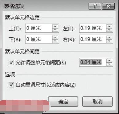 步骤4:弹出“表格选项”对话框,在“默认单元格边距”栏中勾选“允许调整单元格间距”复选框,激活该复选框后,可单击微调按钮设置单元格间距,设置完毕后单击“确定”按钮,如图4所示。