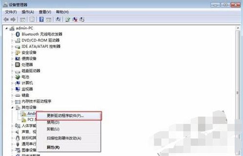 4.然后在打开的设备管理器里面,我们找到里面的一个名为其他设备的项目,点击展开在里面就会看到我们的设备了,右键选中它,然后选择更新驱动程序软件。