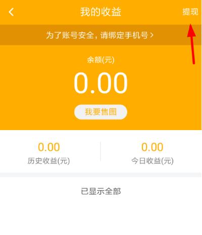 2、而在打开我的收益界面后,大家需要选择页面右上角的“提现”按钮,绑定了手机号的朋友才可以继续提现哦!
