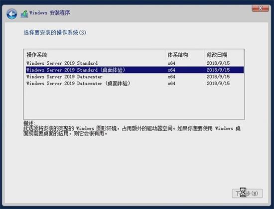 选择要安装的版本,点“下一步”。【版本介绍:Standard:标准版,Datacenter:数据中心版,桌面体验:带Windows的操作界面,否则为DOS操作界面】