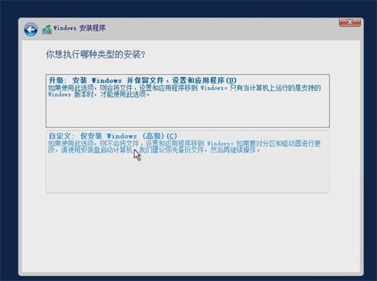 选择安装类型,选“自定义:仅安装Windows(高级)”