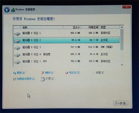 出现选择安装盘界面,选择安装Win2019的那个磁盘,并格式化,点“下一步”。【一般选择“磁盘0”的主分区2,如不确定,在备份了重要资料的前提下,删除分区,然后再新建分区,选择你要安装的磁盘,并格式化。如无“格式化”按钮请点击“驱动器选项(高级)”】
