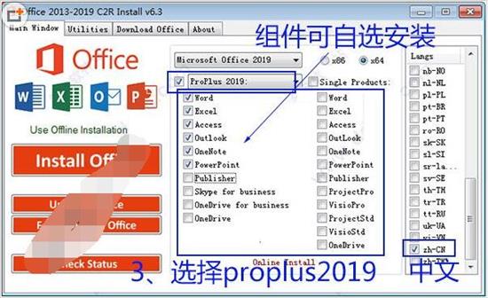 5、重新开机后,打开软件,勾选office propuls 2019,自行选择要安装的组件(word,excel,powerpoint等等),选择x86或x64版本,右边选择zh-CN为简体中文;
