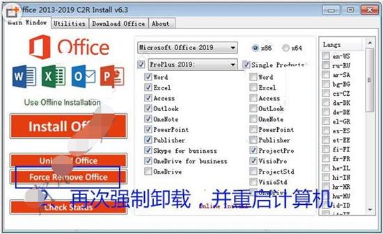 4、卸载完成后,点击“Force Remove Office”,再次强制删除卸载Office版本,等待完成后重新启动计算机。