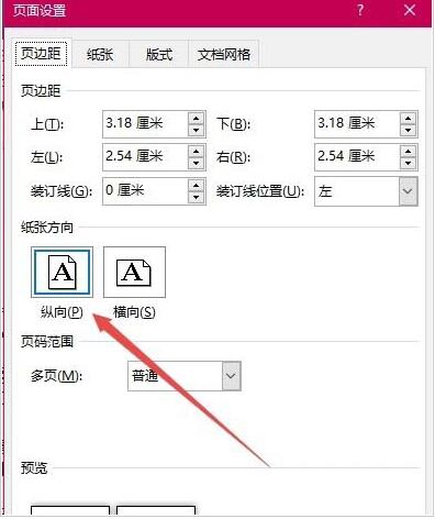 3、在打开的页面设置窗口中,把纸张方向设置为“纵向”