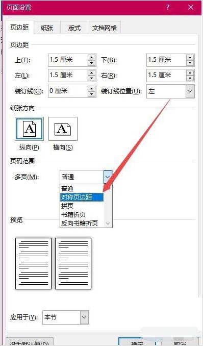 6、另外我们也可以设置纸张为A4,然后在页码范围一项中,把多页的下拉菜单设置为“对称页边距”菜单项,这样也可以把A4的幅面变成了A5的大校