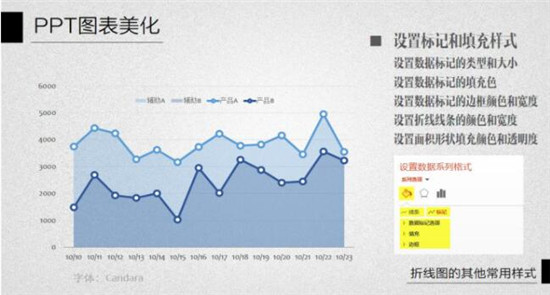 如果同一个折线图中需要展现的数据组并不太多的话,适合使用上面的这种方式来进行改造优化,但是如果同时展现的数据组比较多,使用这样的折线+面积的组合方法在操作上会比较复杂,图形显示上也会比较杂乱不易分辨。在这样的情况下就需要比较灵活的变通,也许用单一的折线图或面积图来绘制会更合适。