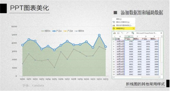 在原有的数据图表中(实际包含两个数据系列,在下面图中的表格中分别显示为【产品A】和【辅助A】数据列)添加第二组数据以及第二组数据的复制数据,假定分别为【产品B】和【辅助B】数据列。