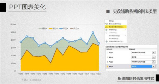在图表中选中【辅助B】系列(可以通过图例来选取),点击右键选择【更改系列图表类型】,在2013版本中会出现一个显示所有系列当前类型的对话框,可以在此对话框中对每一个系列的图表类型进行设置,在这里需要确保的是两个主要数据系列使用的图表类型为“带数据标记的折线图”、而另外两个辅助系列的图表类型均为“面积图”。在其他的版本中不会出现这样的对话框,可以直接选择面积图作为【辅助B】的系列图表类型,并要确保其他几个系列的类型没有用错。