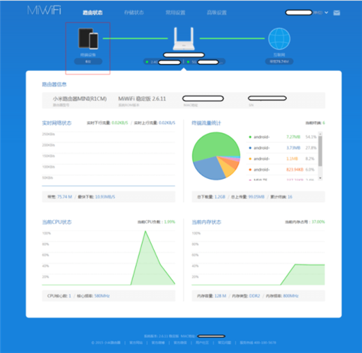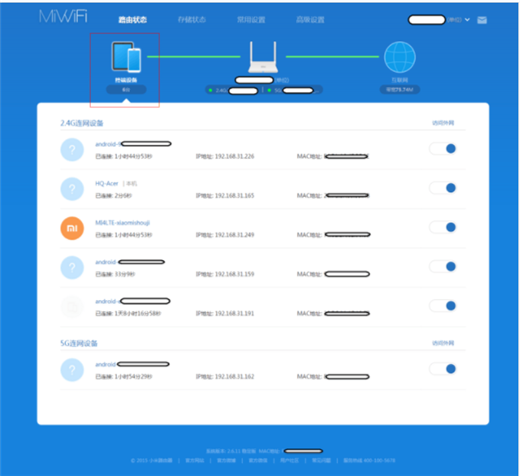 小米路由器,进入管理界面后(miwifi.com),选择终端设备,就可以看到有哪些设备连到你的路由器了(建议对自己和家人使用的设备标好一个名字,以后一看到陌生设备比较好识别)。右边访问外网可以控制这台机器是否能上网,这个招数用在对付熟人蹭网,特别管用,他能连上WIFI,但是你可以让他上不了网。嘿嘿,太坏了,那样别人就觉得你的网络卡,干脆就不连了。