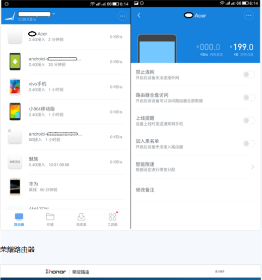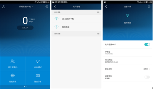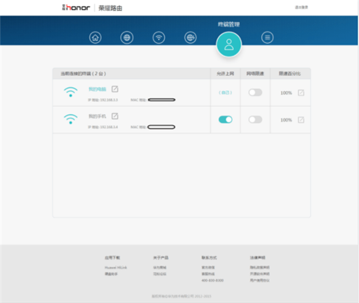 荣耀路由器的操作也类似小米路由器,登陆后(192.168.3.1)选择终端管理,也能看到有哪些设备连上你的网络,同样建议更改你家里的联网电脑手机,方便识别。可以看到右边还提供限速功能,可以设置到让人家能上网,但也不至于太占用你的网络。