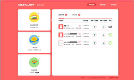 感觉这个界面用起来比小米、荣耀这些还要方便,可以轻松把其他的设备禁用,或者限制他们的上网速度,手机上同样能登陆网址使用,但就是没有APP。不过看了一下,现在TP、水星也出了几款有APP控制的机型了。看来老一辈的路由器厂商也要跟上潮流了。