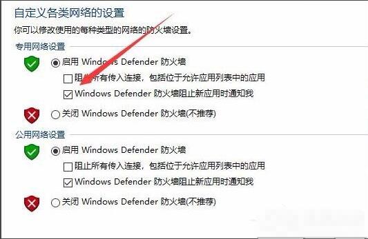 4、在右侧的窗口中找到“Windows Defender防火墙阻止新应用时通知我”一项,并把其前面的勾选去掉就可以了。