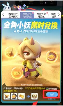 3.4月15日-4月29日期间,通过抓妖可以随机获得金角的犄角、金色的闪粉以及皂角,用这些可以兑换金角小妖符樱