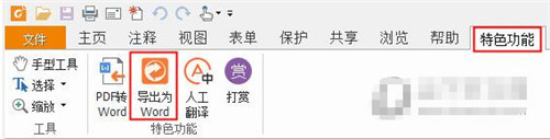 1、打开福昕PDF阅读器,点击功能菜单栏中的“特色功能”,然后选择“导出为Word”;
