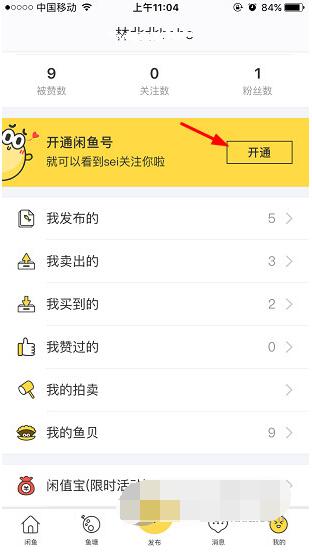 1、点开闲鱼APP,进入主页中的【我的】,然后点击界面中的【开通】;