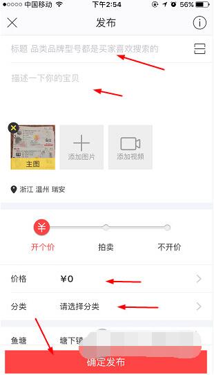 2、然后在相册里选取你想要转卖的商品,填写商品信息、价格、选择分类鱼塘等信息,最后点击发布就可以了,你也可以添加商品视频让买家更加信服。