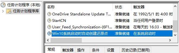 输入密码后即完成任务计划的创建,这时我们就会在“任务计划程序库”中看到刚刚创建的名为“Win10系统启动时自动创建还原点”的任务计划了。如图:
