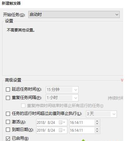 点击“触发器”选项卡左下角的“新建”按钮,在弹出的“编辑触发器”窗口中,把开始任务设置为“启动时”,确定。