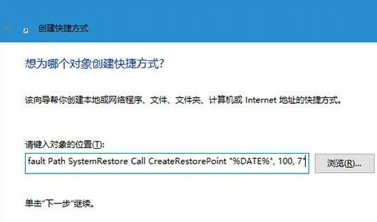 cmd.exe /k “Wmic.exe /Namespace:\rootdefault Path SystemRestore Call CreateRestorePoint ”%DATE%“, 100, 7”