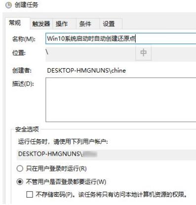 在弹出的“创建任务”窗口中的“常规”选项卡中填写任务计划的名称,例如“Win10系统启动时自动创建还原点”。如图: