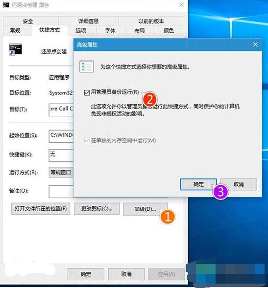 5、在“快捷方式”选项卡中点击“高级。。。”,勾选“用管理员身份运行”,点击“确定”按钮完成(如上图)。