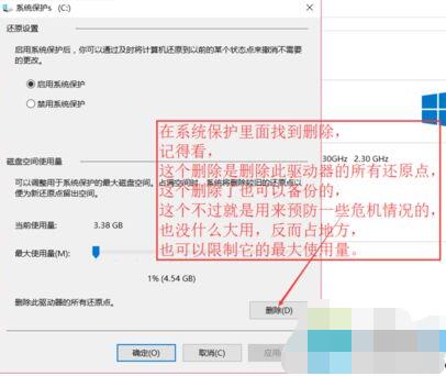 5、在系统保护里面找到删除。记得看,这个删除是删除此驱动器的所有还原点,这个删除了也可以备份的,这个不过就是用来预防一些危机情况的。也没什么大用,反而占地方,也可以限制它的最大使用量,点击继续,就可以删除完毕了。