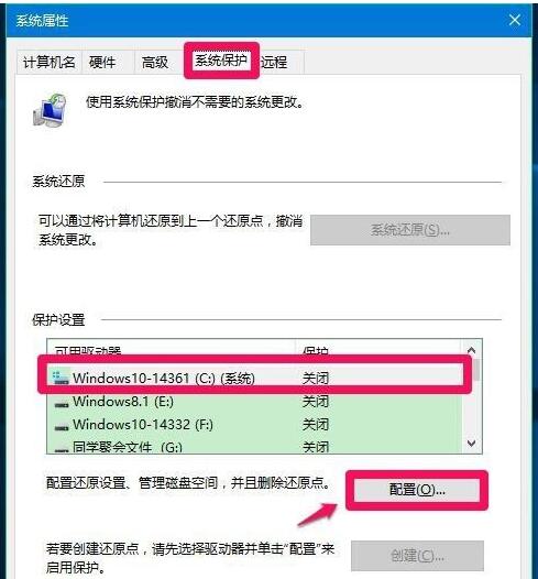 3、在系统属性的【系统保护】窗口,我们可以看到Windows10-14361(C:)保护处于关闭状态,点击【配置】;