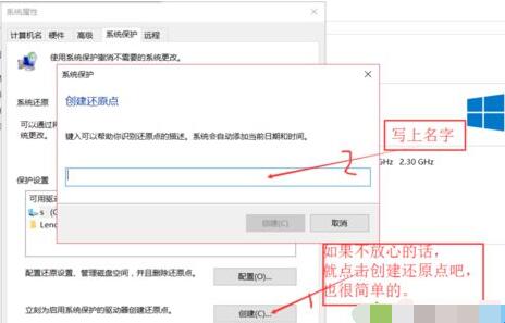 6、如果不放心的话,就点击创建还原点吧,名字随便自己写,也很简单的。