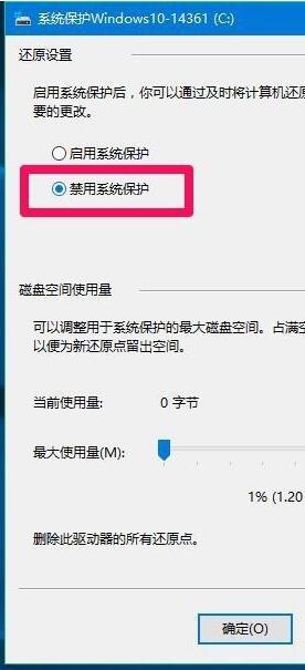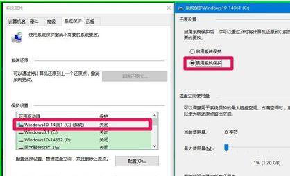 4、在系统保护Windows10-14361(C:)- 还原设置窗口,我们可见其还原设置为:禁用系统保护;