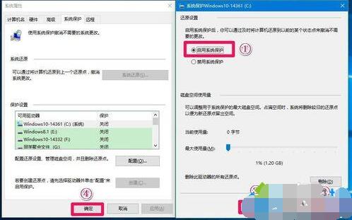 5、我们按照下图中的顺序①点击:启用系统保护,②应用,③确定,④回到系统属性窗口点击:确定;