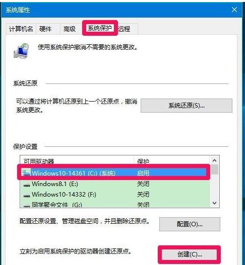 6、我们再打开系统属性 - 系统保护窗口。可以看到Windows10-14361(C:)保护处于启用状态,点击【创建】;