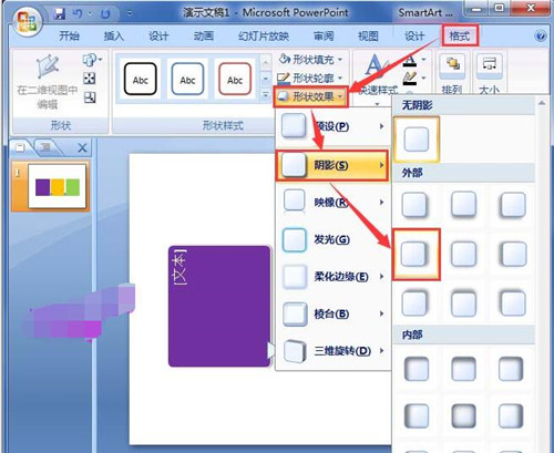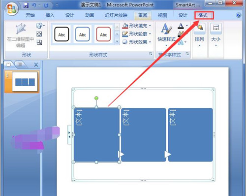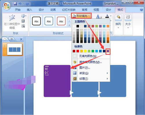 4、先选择其中的一个形状,切换到格式里面,在形状填充里面选择紫色进行填充。