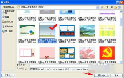 单击“文件”按钮,弹出对话框“插入图片”,选择图片的存放路径,选择后按“插入”即可插入你准备好的PPT背景图片;