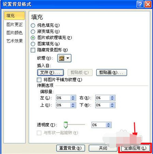 之后回到“设置背景格式”窗口中,之前的步骤只是为本张幻灯片插入了PPT背景图片,如果想要全部幻灯片应用同张PPT背景图片,就单击“设置背景格式”窗口中右下角的“全部应用”按钮。