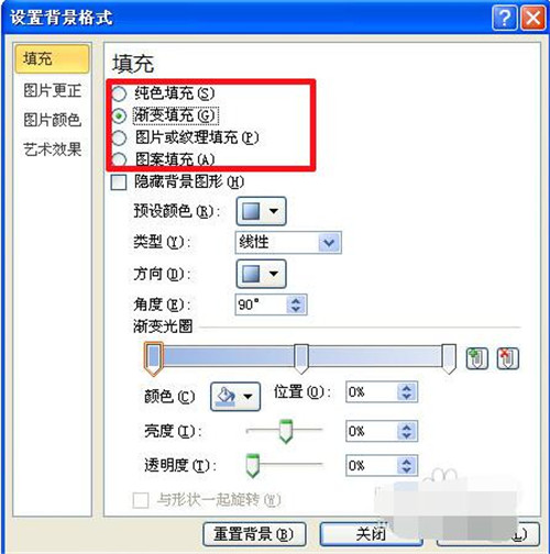 在弹出的“设置背景格式”窗口中,选择左侧的“填充”,就可以看到有“纯色填充”,“渐变填充”,“图片或纹理填充”,“图案填充”四种填充模式,在PPT幻灯片中不仅可以插入自己喜爱的图片背景,而且还可以将PPT背景设为纯色或渐变色。
