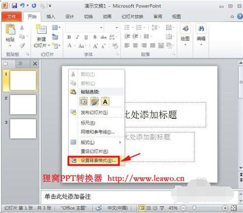 在打开的PPT文档中,右击任意PPT幻灯片页面的空白处,选择“设置背景格式”;或者单击“设计”选项卡,选择右边的“背景样式”中的“设置背景格式”也可以: