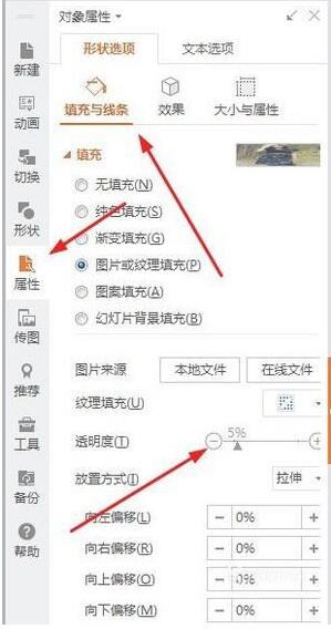05然后我们双击图片后,右边会弹出“属性”的设置,我们会看到栏目上有“填充与线条”的菜单,在菜单下我们会看到“透明度”的选项,我们左右滑动就可以设置图片的透明度了。如图