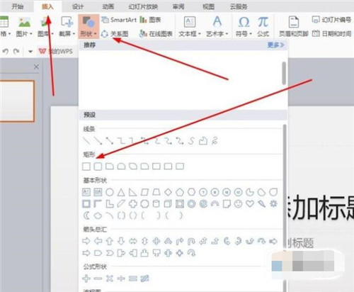 02然后我们在PPT顶部“插入”栏目内找到“形状”选项,点击会弹出菜单,我们选择“矩形”图标 如图