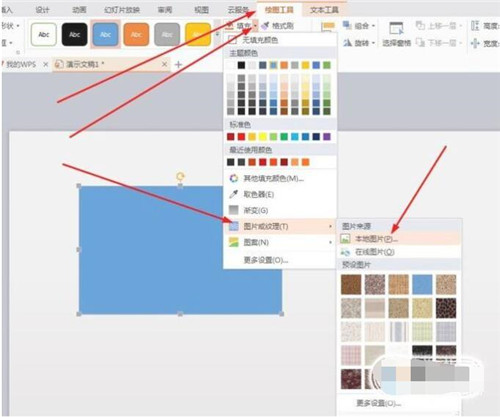 04然后我们点击矩形框后点击上方的“绘图工具”栏目下找到“填充”点击后会弹出菜单,选择“图片或纹理”选项会继续弹出菜单我们选择“本地图片”后上传我们需要的背景图片。如图