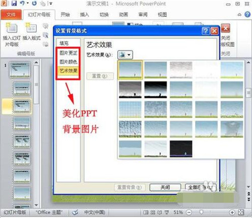 在PowerPoint2012版本中,“设置背景格式”窗口有“图片更正”,“图片效果”以及“艺术效果”三种修改美化PPT背景图片的效果,能调整图片的亮度对比度或者更改颜色饱和度、色调、重新着色或者实现线条图、影英蜡笔平滑等效果,看个人需要自由发挥啦: