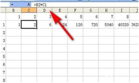 3.把刚才的公式横着向右拖动,公式中的参数就会自动安装默认的规则变化。例如C2中的公式变化了。变成了B2*C1。