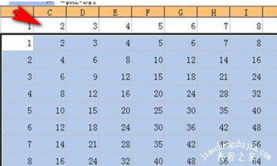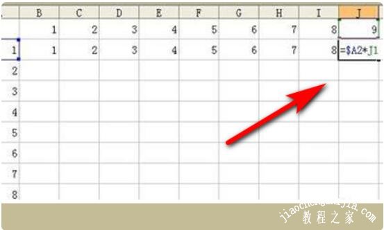 4.为了让第一个乘数A1固定,不再变化。我们就需要用到绝对引用。我们需要将第一个第一个的公式改为=$A2*B1。这样的话公式在向右拖动过程中,A参数就不再变化。如图是拖动到最右端的时候效果。