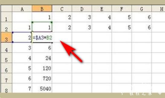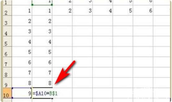 6.为了让第二个乘数B1固定,不再变化。我们就需要用到绝对引用。我们需要将公式改为=$A2*B$1。这样的话公式在向右拖动过程中,A参数就不再变化。并且公式在向下拖动过程中,第二个参数中的2就不再变化。如图是公式拖动到最下端的效果。