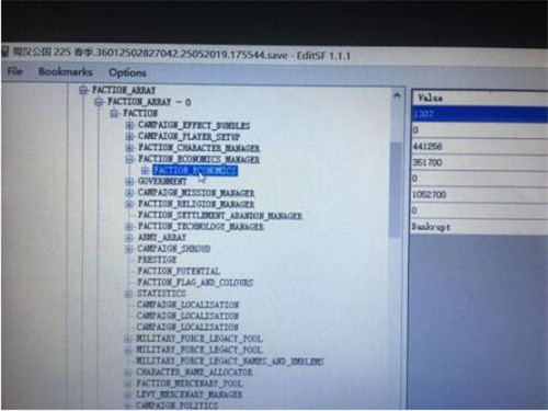点开faction_array后会发现有一大串faction_array,后面都缀着数字,选第一个faction_array-0,这就是玩家自己的势力数据,下面那些是其他势力的也可以修改(举个例子将来如果袁绍做大,你可以修改他的财政让他破产)选择第一个后,选择里面的faction_economics_manager,双击后点击其下面的faction_economics,右侧第一行的数字即为汝现在的钱财,任君修改。比如在下修改至10倍。
