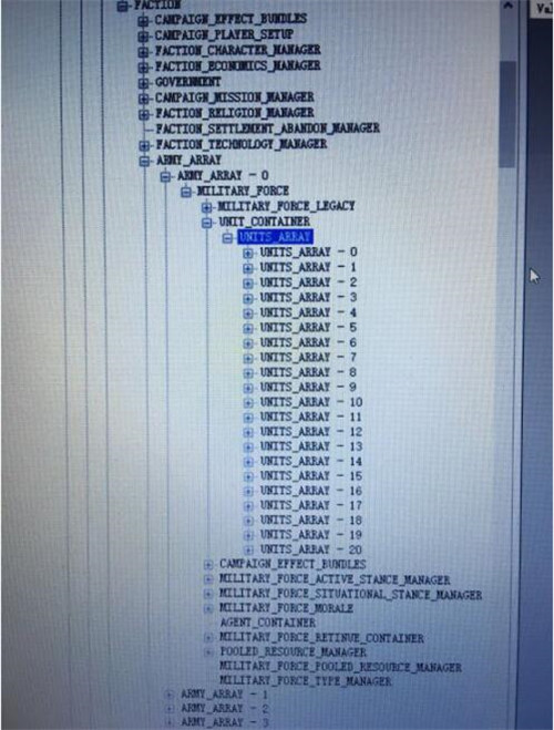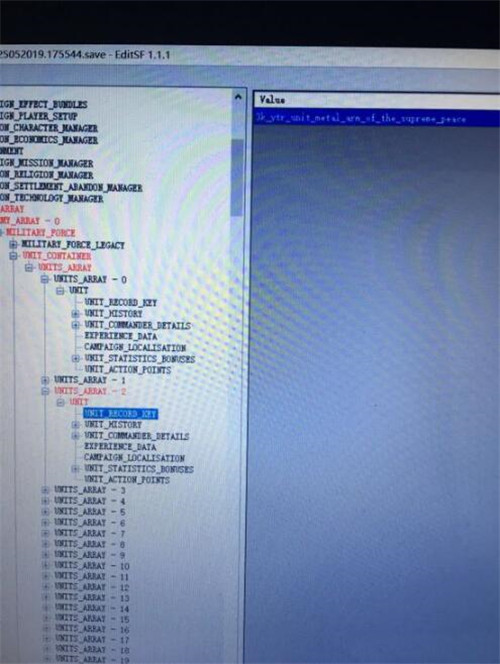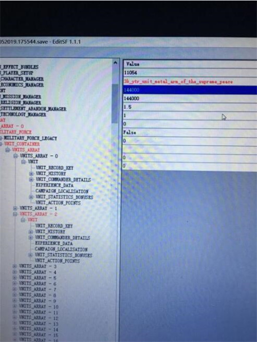 有好几个序号,其中有你的将领部队,还有驻军,你需要找一下分别对应你哪几支部队,打开其中一个,点击unit_container/ units_array/ 这下面就是你某支部队的配置了,你可以找到将领名字或兵种来彻底确认究竟是哪只部队,(一般来说开局默认的满编都是0号。咱们这只army_array-0就是刘关张的满编)unit_array下有0至20共21个数字,就是21支部队,其中3位将领,18支部队。