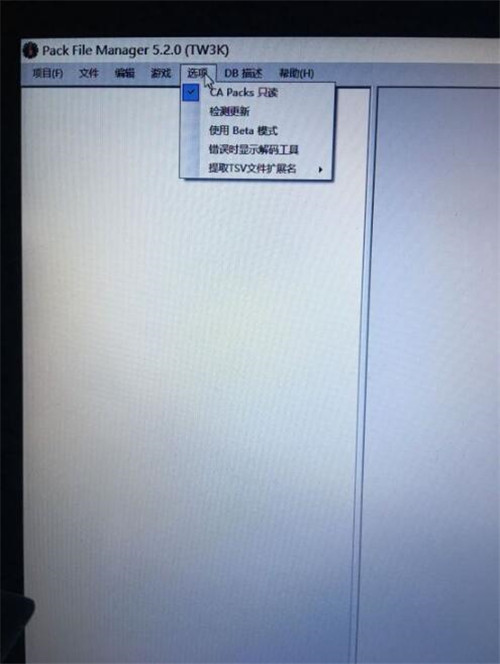 即为修改招募条件,包括可招募派系修改,招募科技修改,首先,游戏里有些高级兵种,需要相应科技才能解锁,可以进行修改,使一开始就能招募,比如五龙军,乾天坤地,然后还存在很多特色势力兵种,比如魁首前军,左阵军,黄巾军各种变态,等等。首先,先确定最基础的派系归属,因为除了黄巾军之外大家皆为汉室忠臣,所以只需修改黄巾军的归属就好,(如果仅想招募汉室兵种可略过此步骤)用pfm打开游戏文件data下的database.pack,并且点击pfm左上角的选项,把ca packs只读关闭。