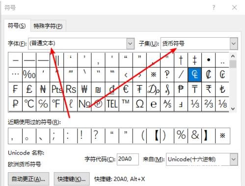 1. 如果我们想要插入货币符号就需要将字体设置为普通文本,然后在后面的子集处选择货币符号。