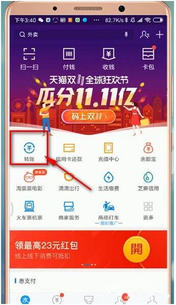 1、首先打开支付宝app,然后点击首页中的“转账”;