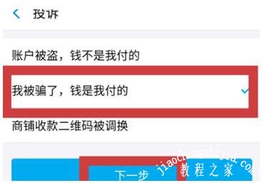 进入“投诉”界面,因为我们是被骗或者转账时候付错人了,钱是我们支付的,所以这里选择第二栏“我被骗了,钱是我付的”,然后点击下方的“下一步”。